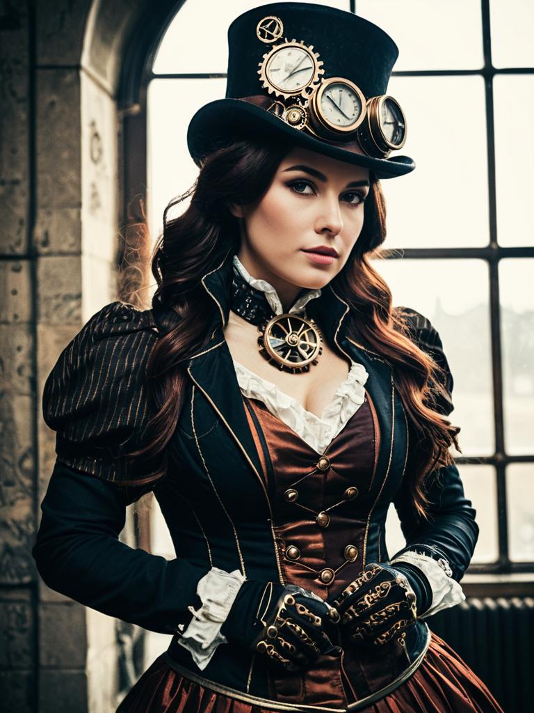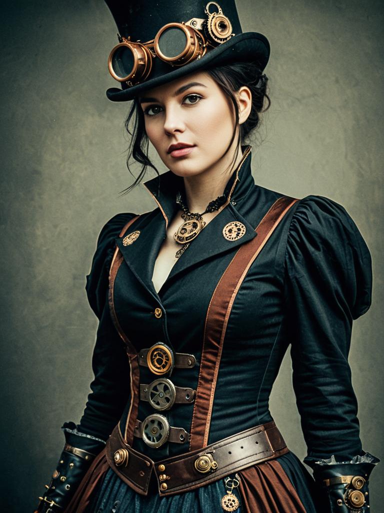 Woman in Steampunk Lady Costume, waist-up editorial portrait, photorealistic tones