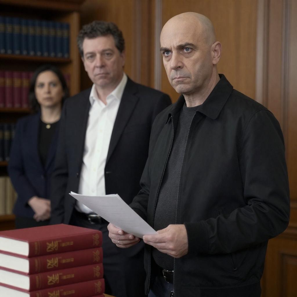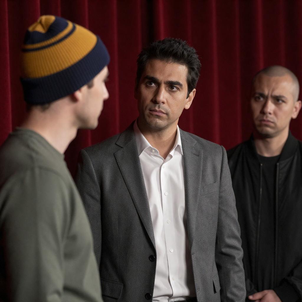 Photograph of two men in a close-up shot. Bald man with light stubble, intense gaze, wearing gray hoodie and necklace. Other man with gray baseball cap, back to camera, dark hair visible. Dimly lit indoor background.
