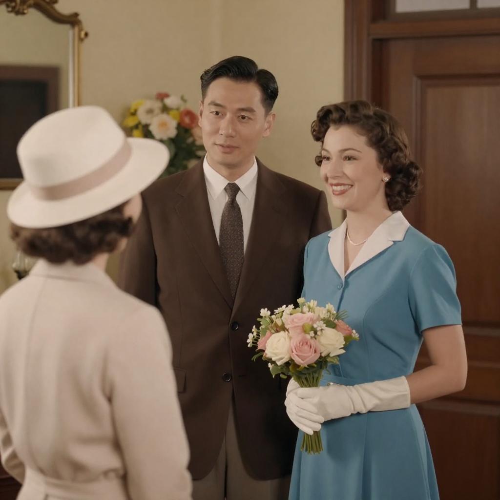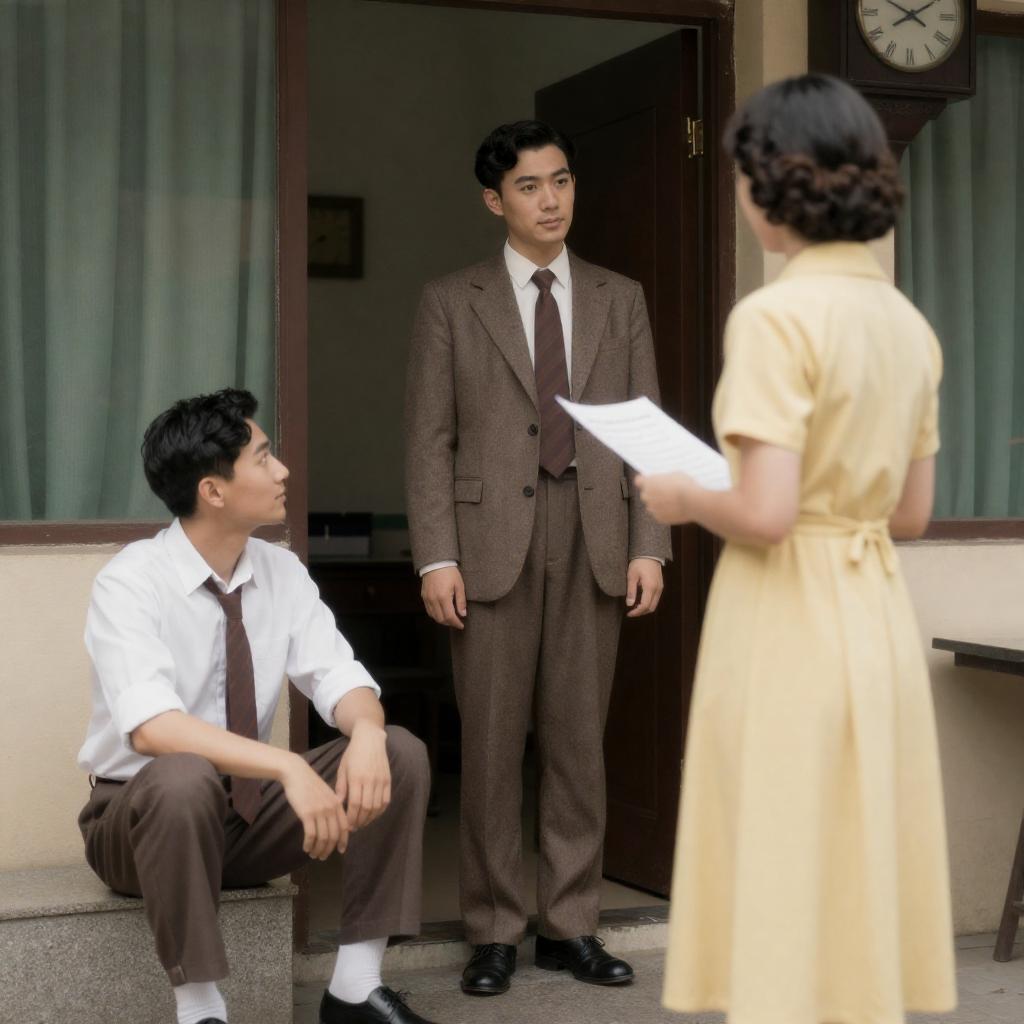 A vintage-style photograph shows a man in a brown suit standing in a doorway, facing a woman in a yellow dress holding a paper. A man in a white shirt and brown pants sits on a step to the left. The background features green curtains and a clock. The image has a warm, nostalgic feel.