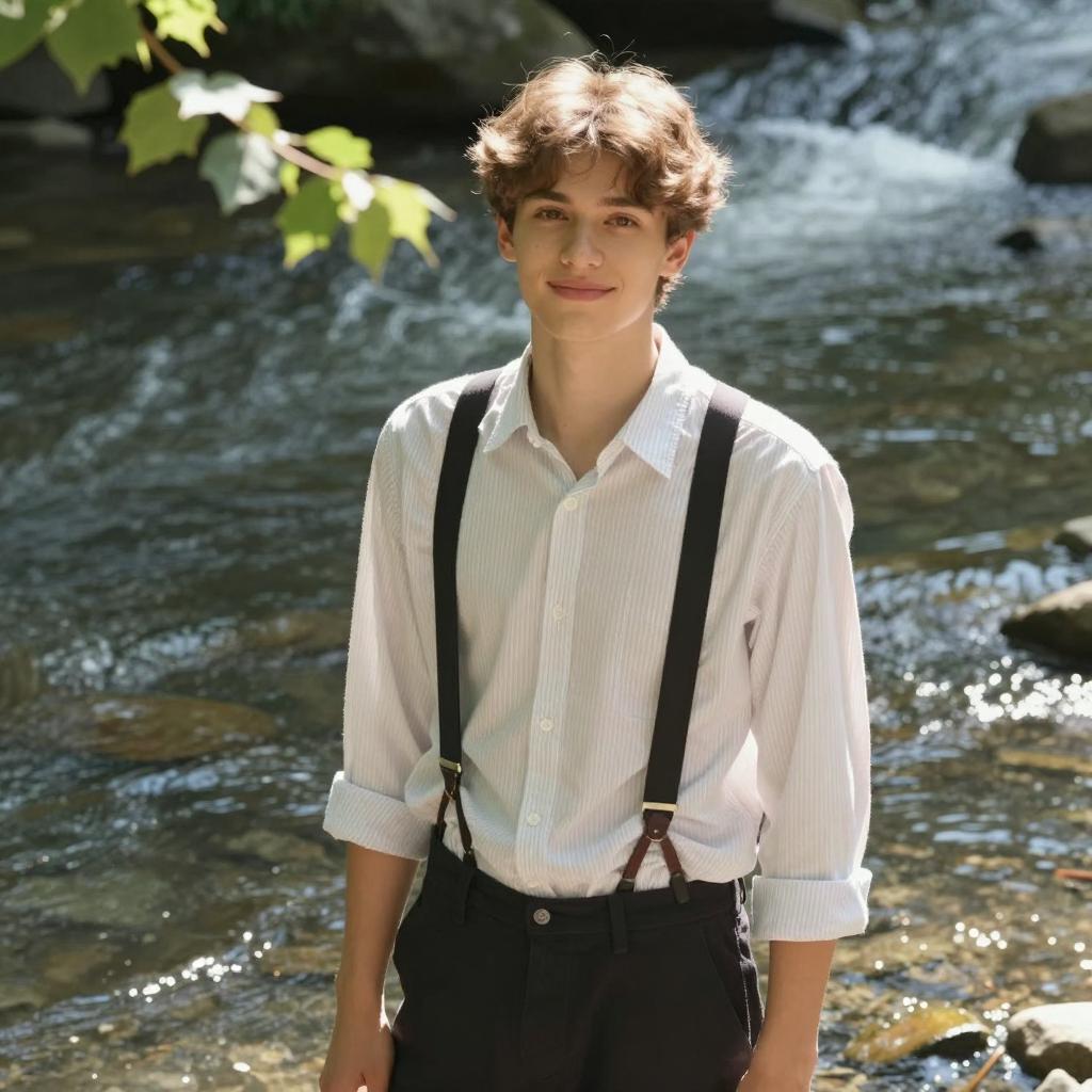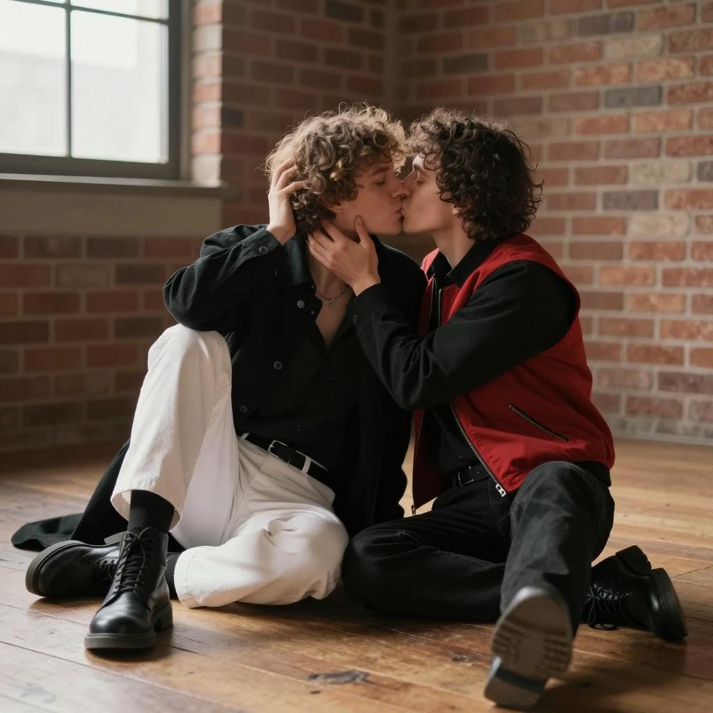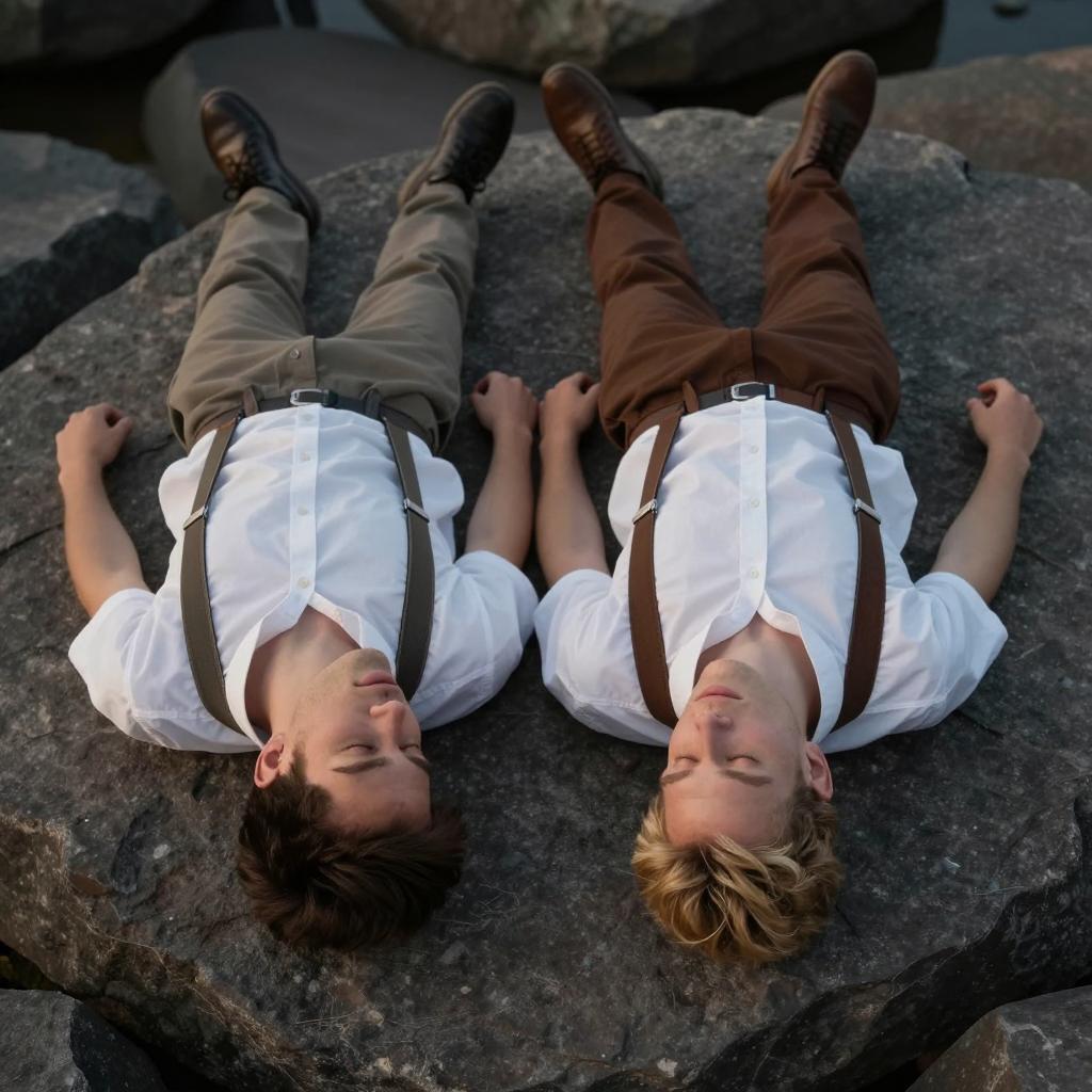Two men lying on a pile of dark rocks, heads back, eyes closed. Both wear white shirts, brown pants, and suspenders. Man on left has brown hair, man on right has blond hair. Both arms extended, legs spread apart. Background includes more rocks and dim light.