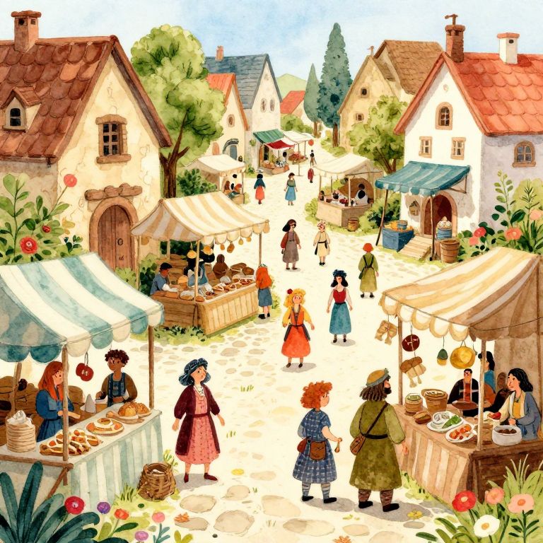 Whimsical village market scene in colorful, detailed digital illustration. People in vintage clothing browse stalls with fresh produce and flowers. Cobblestone street,