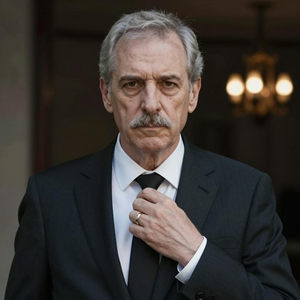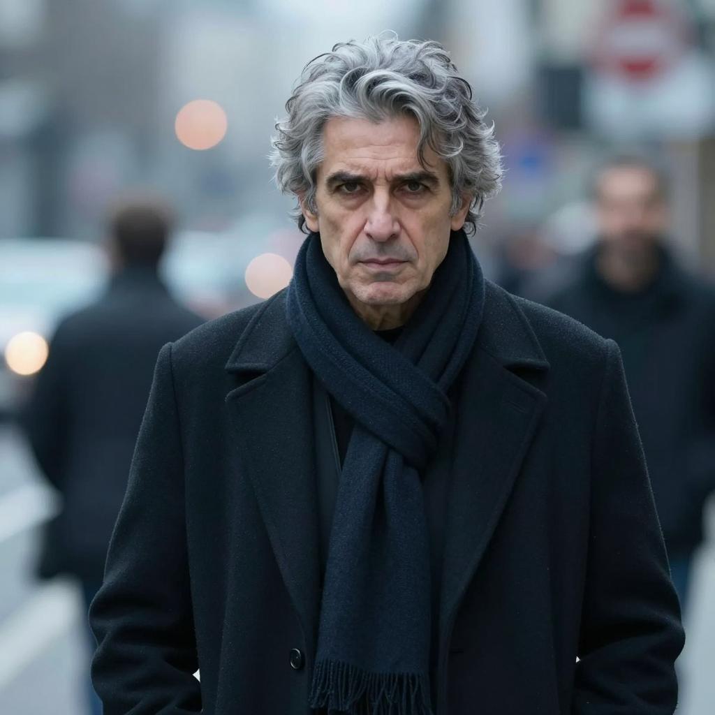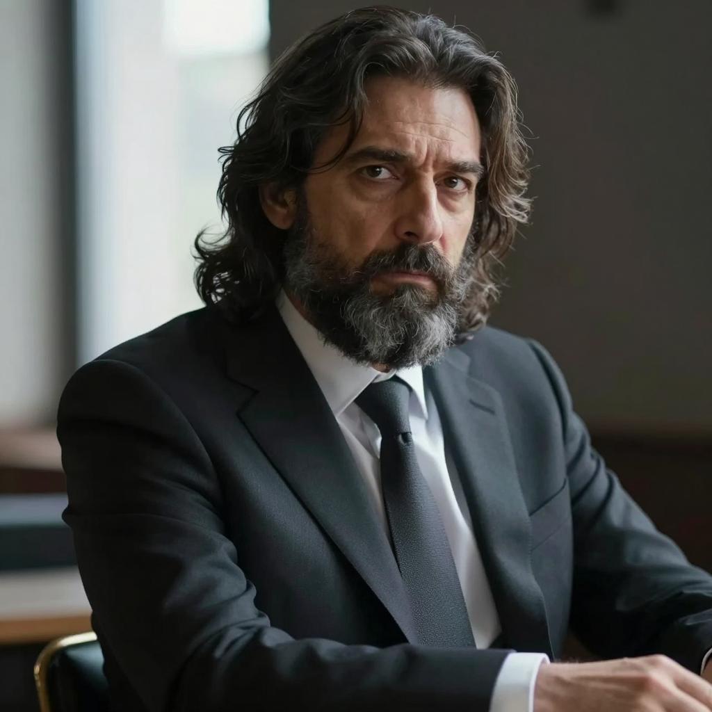 Middle-aged man with long, dark, wavy hair and full beard, wearing a dark suit and white shirt with a tie. He has a serious expression, looking slightly to the right. Background is dark with blurred, light-colored window. Right arm rests on an object, partially visible.