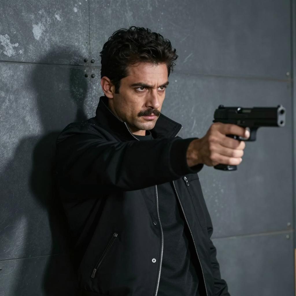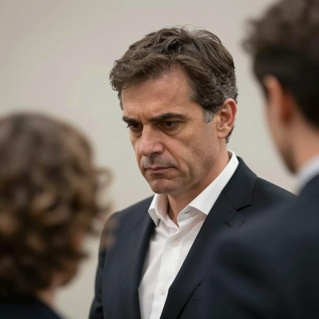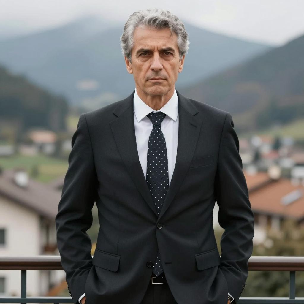 Middle-aged man with long, dark, wavy hair and full beard, wearing a dark suit and white shirt with a tie. He has a serious expression, looking slightly to the right. Background is dark with blurred, light-colored window. Right arm rests on an object, partially visible.