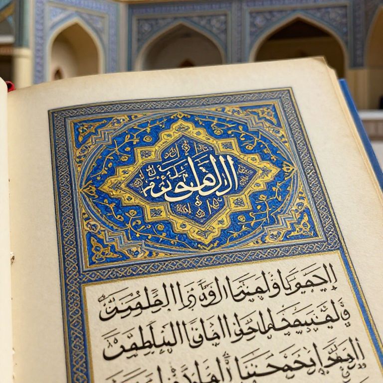 Prompt Islamic: A serene Islamic manuscript art style depicting a calligraphic verse from the Quran, vibrant blues and golds, intricate geometric patterns, soft lighting, traditional Islamic architecture in the background, ancient illuminated page aesthetic, detailed ink lines, minimal modern elements.