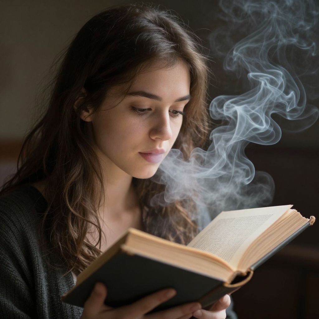 A young woman engrossed in reading exhales wisps of ethereal smoke that weave through the pages of an ancient tome, defying the boundaries between her breath and the book's timeless wisdom.