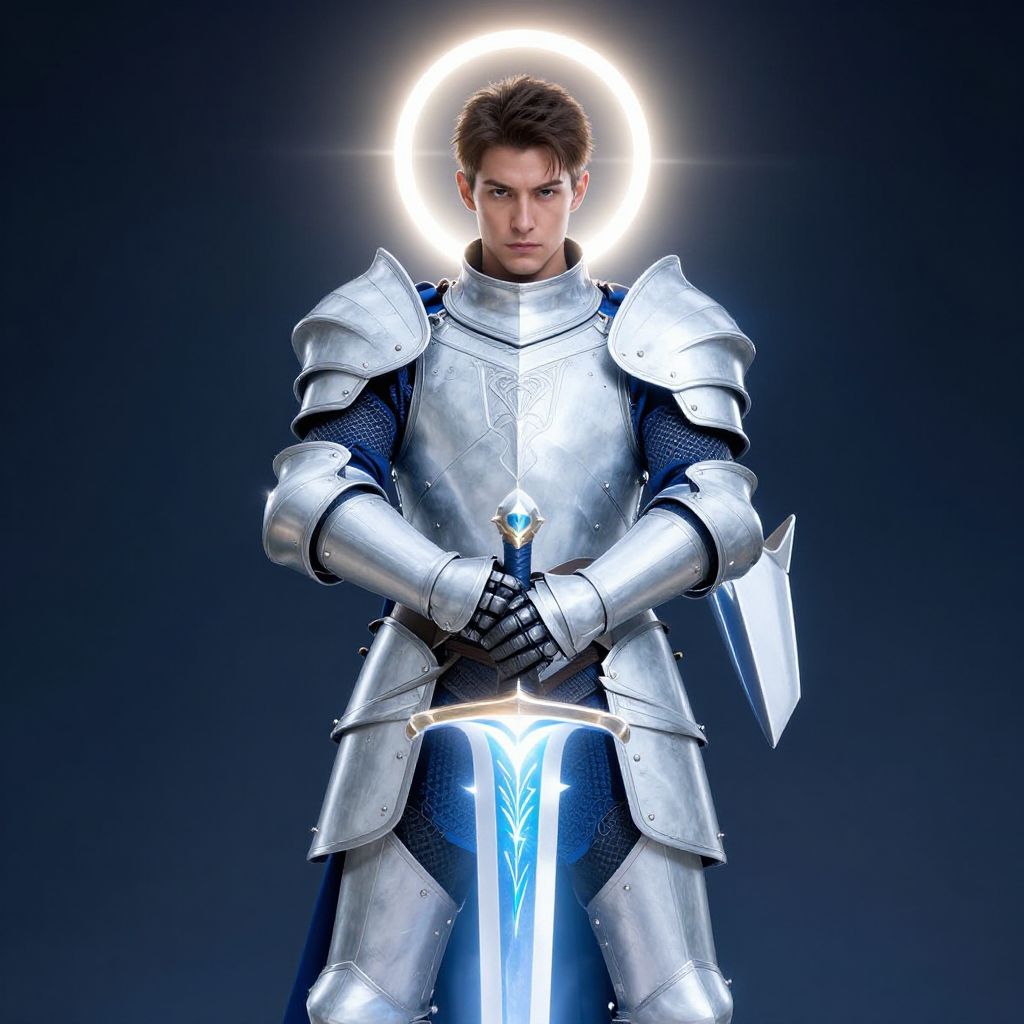 Human male paladin portrait, strong build in gleaming white and blue armor, holding a glowing sword, halo of light behind, heroic and valiant pose, fantasy realism style