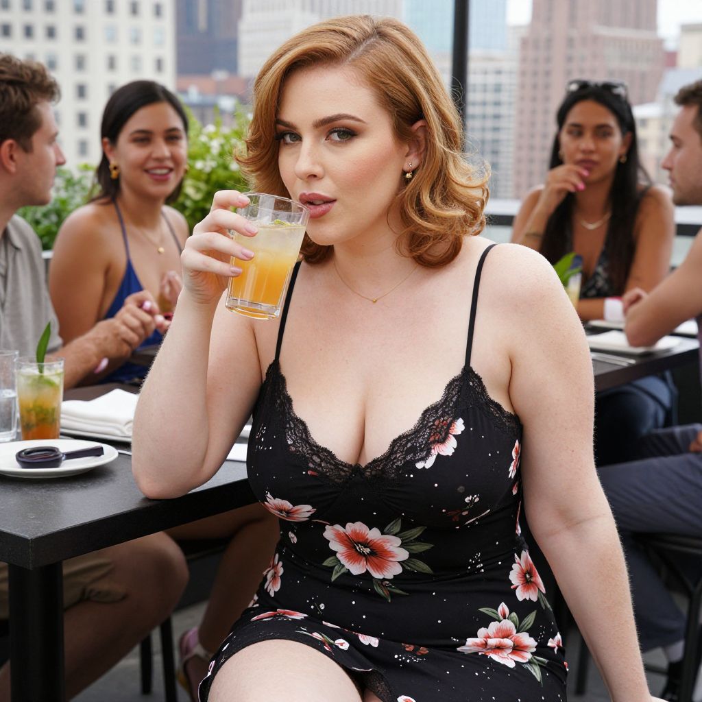 A stocky woman in a black floral slip dress with spaghetti straps and lace trimming lounges at a rooftop dining spot in New York City, enjoying a refreshing drink while chatting with friends. The scene is infused with the vibrant visual style of Audrey Flack. Sexy. Pretty face and beаutiful eyes. Big breasts