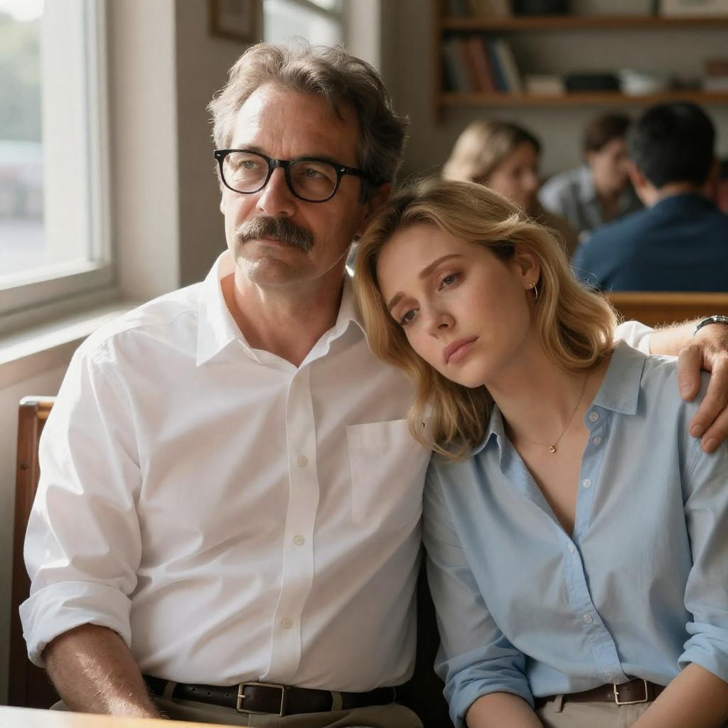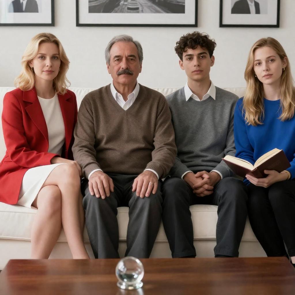 Photograph of four people sitting on a white couch. Blonde woman in red coat, white dress, crossed legs. Middle-aged man with mustache, brown sweater over white shirt, hands on lap. Young man in gray sweater over white shirt, hands on lap. Young blonde woman in blue top, black pants, reading book. Dark wood desk in foreground with glass paperweight. Framed pictures on wall behind. All have neutral facial expressions.