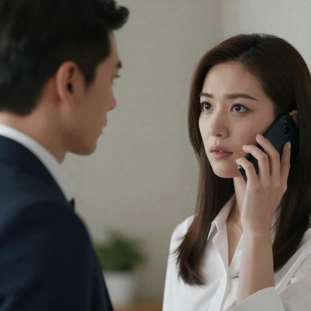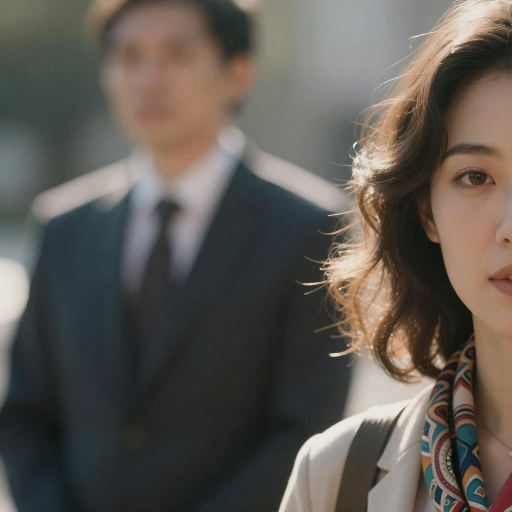 Photograph of a close-up scene showing a blurred, sunlit figure in the background wearing a suit, while a woman with wavy brown hair and a colorful patterned scarf is in sharp focus on the right. Sunlight creates a lens flare effect.