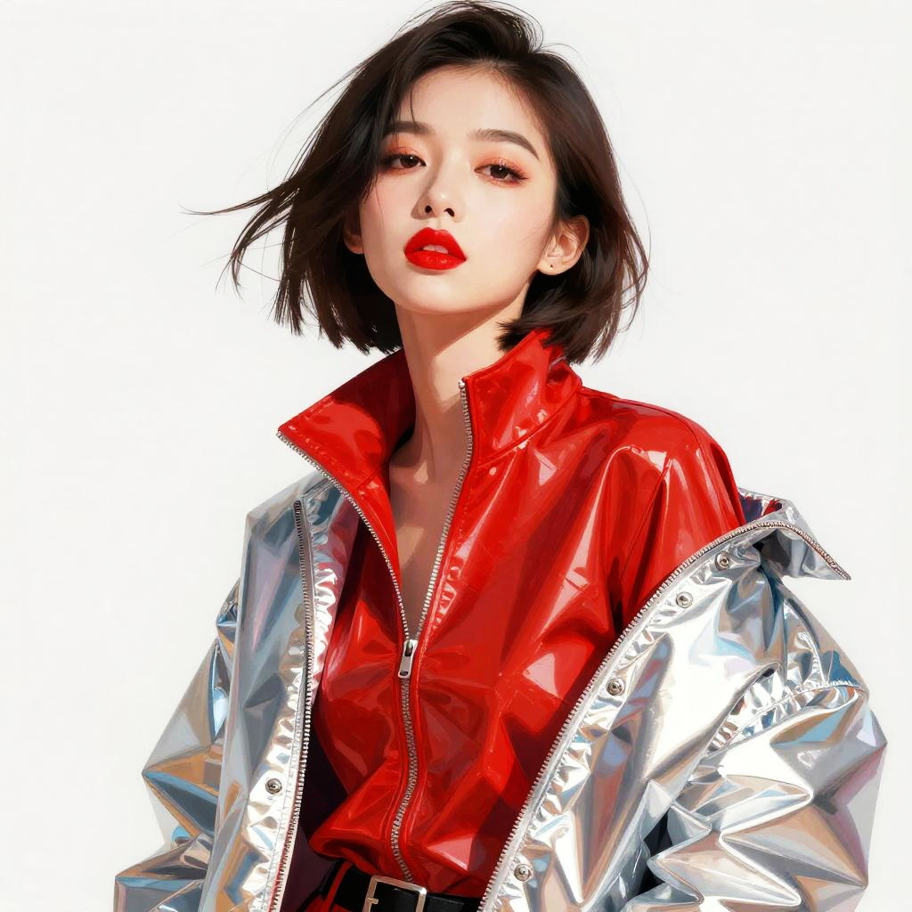 This digital art features a stylish woman with short, dark hair and bright red lipstick. She's wearing a shiny red jacket with a high collar, partially covered by a silver, reflective jacket. The background is a plain, bright white, making her vibrant colors pop. The art style is modern and slightly abstract, with bold, contrasting colors and sharp lines.