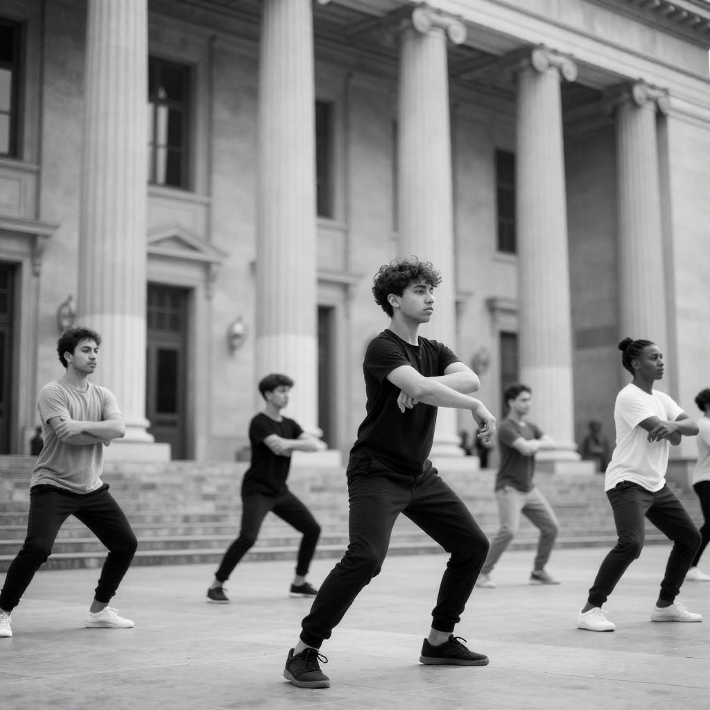 Black-and-white photograph of a diverse group of dancers in mid-motion, performing in front of a grand, classical building with tall columns. The dancers, wearing casual clothes, are positioned in various dynamic poses, creating a sense of movement and energy. The background features architectural details and bright light.