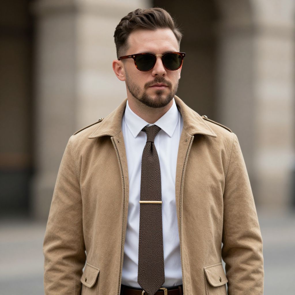 Photograph of a white man with a neatly trimmed dark beard and short, styled brown hair. He wears dark aviator sunglasses, a white dress shirt with a dark brown patterned tie, and a tan, textured, zip-up jacket with shoulder epaulettes. The background is blurred, showing a gray stone building. His expression is serious and he stands with a confident posture. The image has a slight vignette effect, drawing focus to the man's face. The overall style is modern and sophisticated.