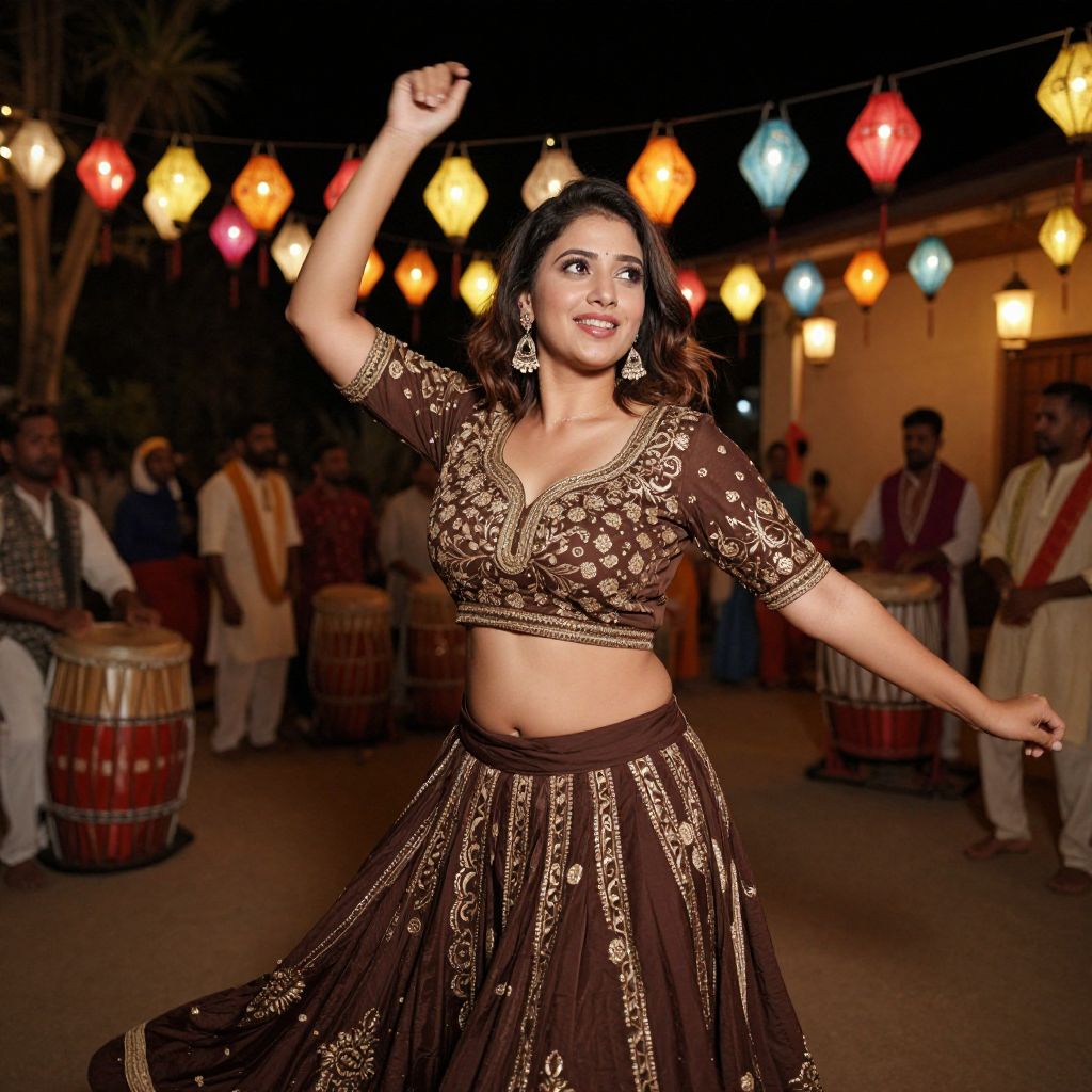 A festive and lively scene of a woman with medium-length dark brown hair and bright, friendly eyes wearing a stylish brown ghagra choli costume, dancing in a cultural celebration in a village courtyard, with traditional drums and colorful lanterns lighting up the night.. The woman has big tits and cute face