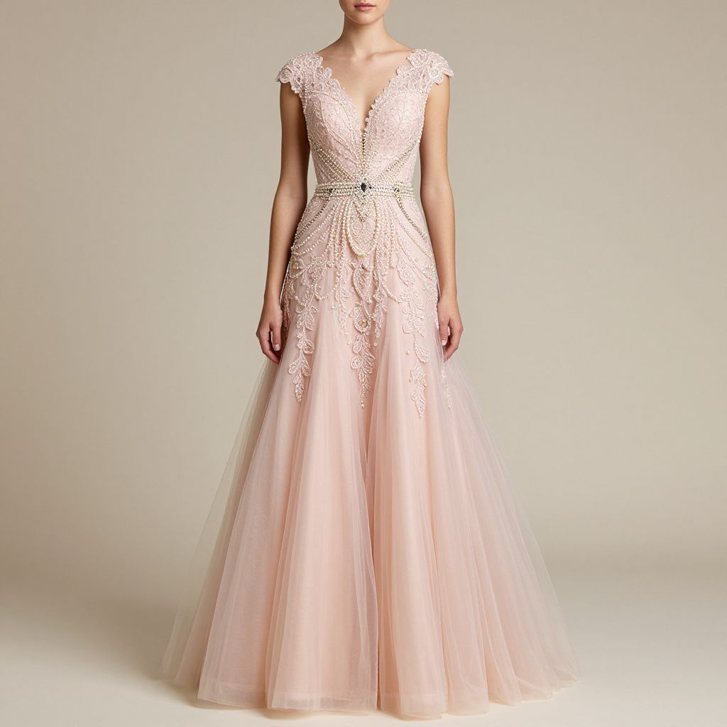 Photograph of a woman wearing an elegant, sheer-lace, pink ball gown with a deep V-neck and short cap sleeves.