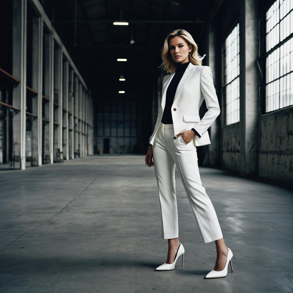 Woman in Versace hi heels boots, color photo by Sølve Sundsbø, wearing tailored crème jumpsuit with gold-wide belt accents, in high-rise industrial loft studio with expansive city views, high-fashion editorial, cinematic lighting, full-body shot, elegant pose, sharp focus, rich textures, glossy magazine aesthetic.