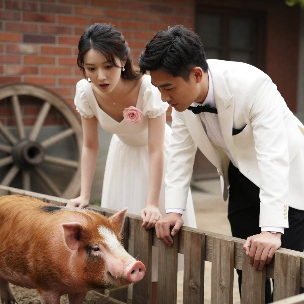Photograph of a man and woman leaning over a wooden fence, observing a brown pig. Man in white suit with black bowtie, woman in white dress with pink flower. Brick wall and wooden wheel in background. Woman looks surprised.