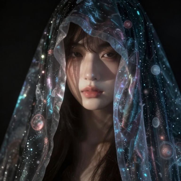 Visualize an alluring close-up portrait of an enigmatic figure shrouded in glistening fabric adorned with mesmerizing patterns reminiscent of celestial bodies. Soft, ethereal light from an unconventional angle illuminates the intricate folds of the iridescent material, casting a spell of intrigue as the subject's face remains veiled in shadow. This captivating scene masterfully intertwines tranquility and unease, inviting viewers to delve into the mysterious atmosphere surrounding this enchanting figure.