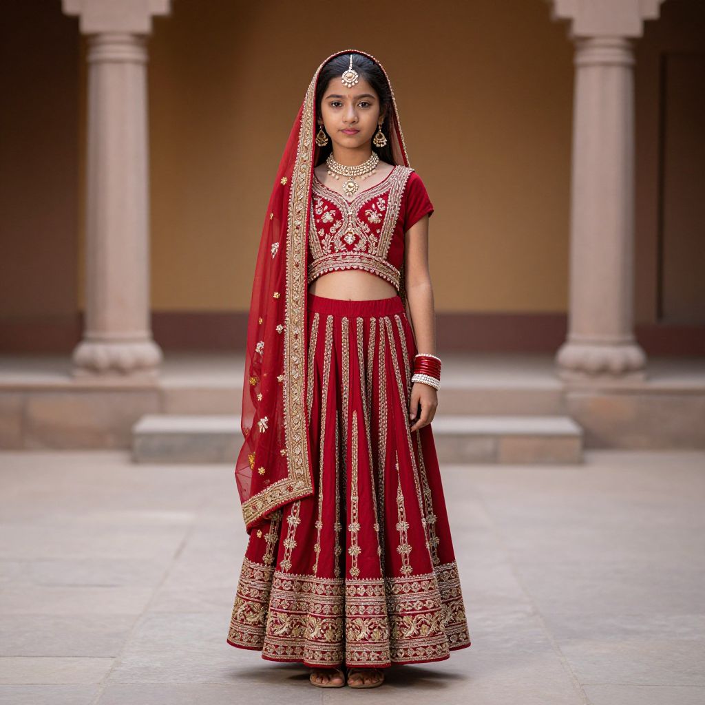 Photograph of a young Indian woman standing in a traditional setting with beige columns in the background. She is wearing a vibrant red bridal lehenga with gold embroidery and a matching red dupatta draped over her head and shoulders. Her outfit includes a short-sleeved crop top with intricate gold patterns, a long flowy skirt, and black traditional footwear. She has dark hair, a fair skin tone, and is adorned with gold jewelry, including a maang tikka, earrings, necklace, and bangles. The floor is light-colored stone, and the lighting is soft, highlighting her elegant and traditional attire.