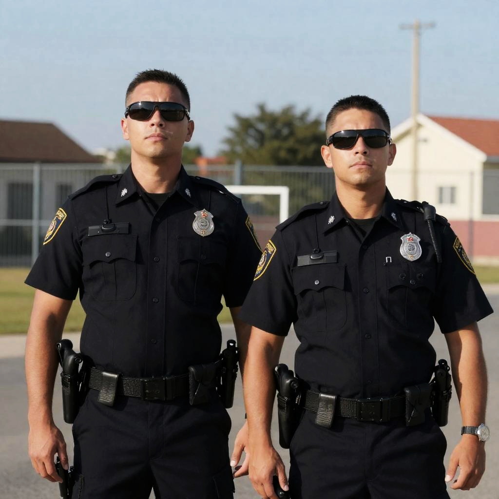 Photograph of a male police officer standing beside a white police car. Officer wears dark sunglasses, black jacket with police badge on left sleeve, black shirt, and dark pants. Car has "POLICE" on side and roof light bar. Background shows a bridge and mountains under a clear sky. Officer smiles slightly, looking directly at camera.