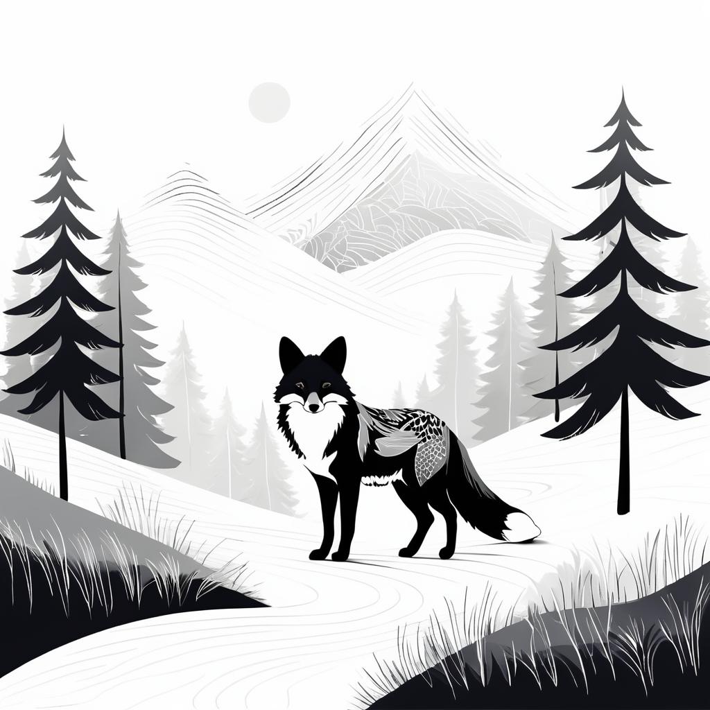 Landscape painting of a hand-drawn illustration of a fox, in a minimalistic style with monochrome patterns on a white background, high quality.