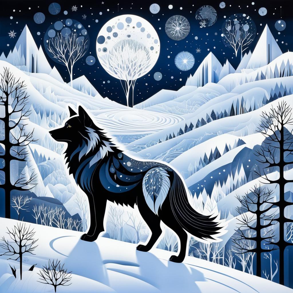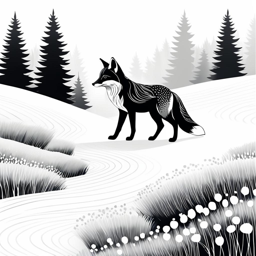 Hand-drawn minimalistic black and white illustration of a fox standing on a textured landscape with stylized trees and grass in the background. The image uses monochrome patterns with intricate lines and dots on a white backdrop, emphasizing simplicity and contrast.