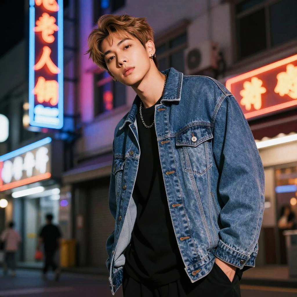 Asian with light brown hair wearing modern street fashion, vibrant urban background with neon signs, dynamic pose, high contrast lighting, cinematic atmosphere