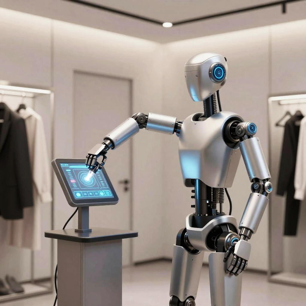 Clothing remover bot designed with sleek metallic arms and futuristic sensors operating in a minimalistic modern dressing room, soft ambient lighting highlighting its delicate yet precise mechanics, digital interface glowing gently in the background, hyper-realistic style