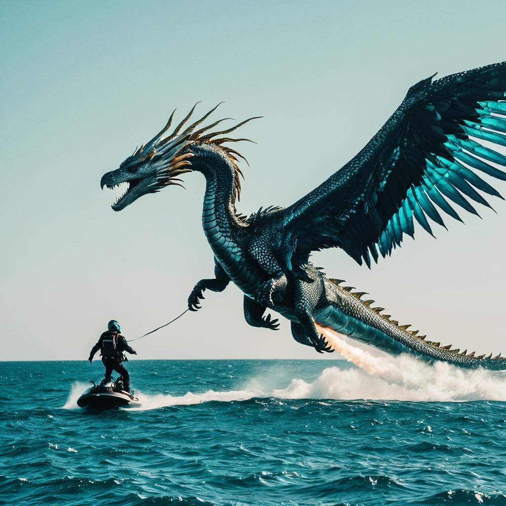Parallelogram alien riding a hoverboard in front. A very big octopus in the background trying to eat the whole picture, surreal style with purple, teal, black colors, 8k, psychedelic, 16X9 - Upscaled by.