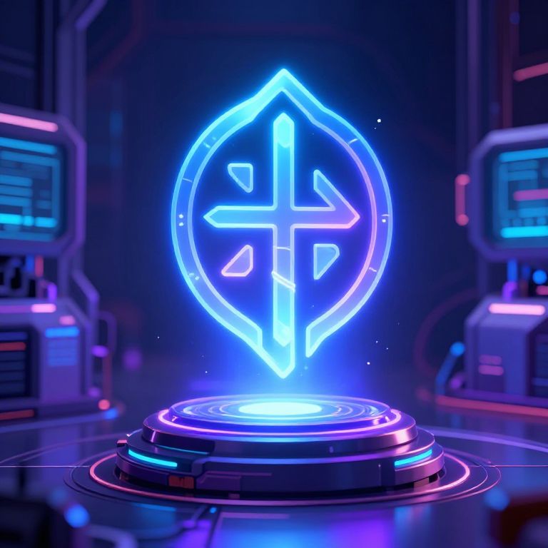 Futuristic sigil floating holographically above a high-tech pedestal, glowing neon blue and purple, in a sci-fi laboratory with metallic surfaces and complex machinery, sleek and vibrant, ultra-modern magical technology