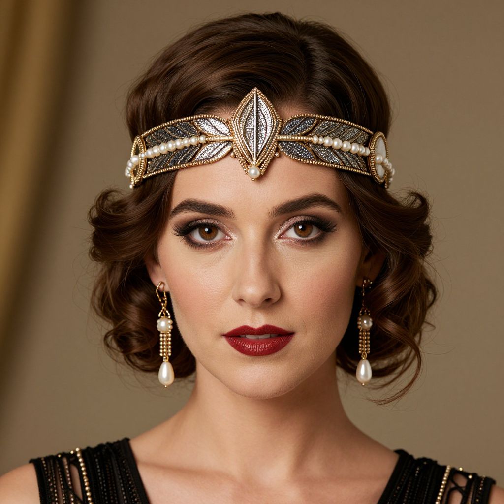 Elegant brown-haired woman wearing a shimmering Art Deco-inspired headband adorned with leaf medallions and pearl accents, embodying the 1920s Flapper style for a glamorous party look.