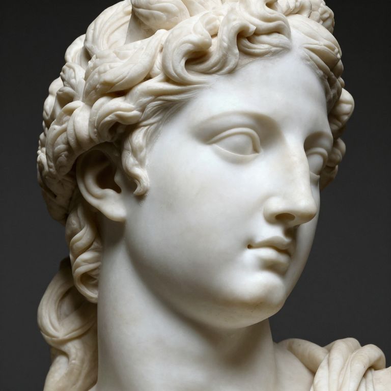 Photograph of a detailed white marble bust of a classical female figure with intricately curled hair, soft facial features, and a serene expression, set against