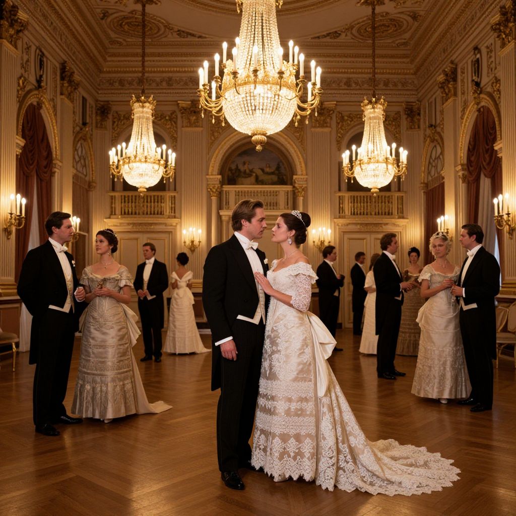 190s elegant ball scene inside a grand Victorian ballroom, men in formal suits and women in long dresses with intricate lace, chandeliers casting warm light, richly decorated walls and detailed architecture, opulent and refined ambiance