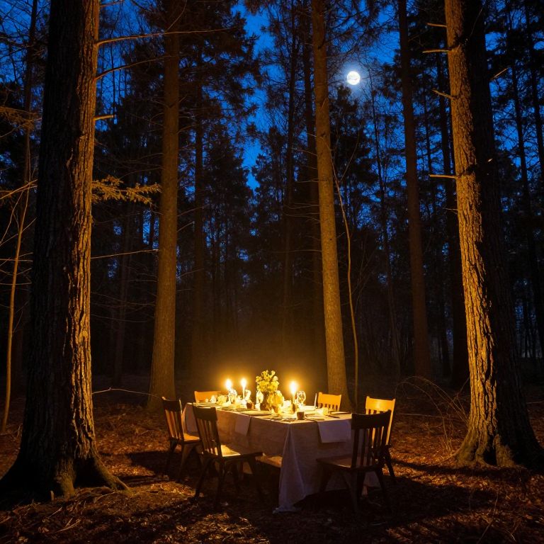 Photograph of a romantic, candlelit outdoor dinner table set in a dark forest at night, with tall trees and a full moon in the blue twilight