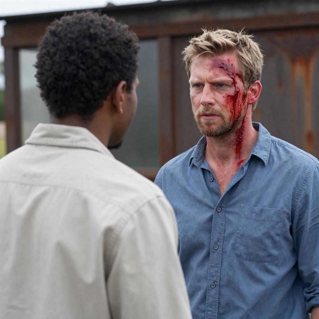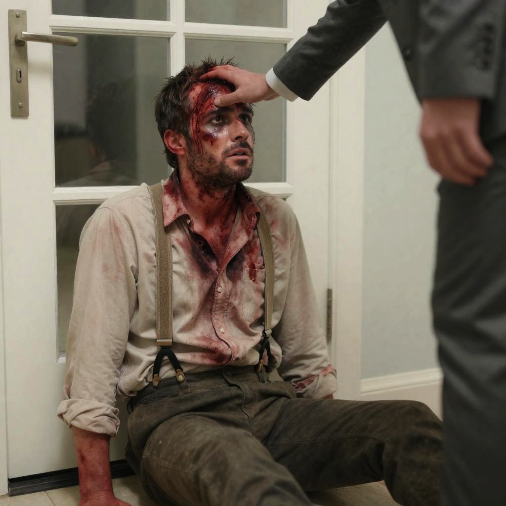 Photograph of a disheveled, middle-aged man with short, blonde hair and blood on his face, leaning forward. He wears a white, slightly torn shirt. Dark, grassy background with a rusty wooden fence. Man's expression is distressed.