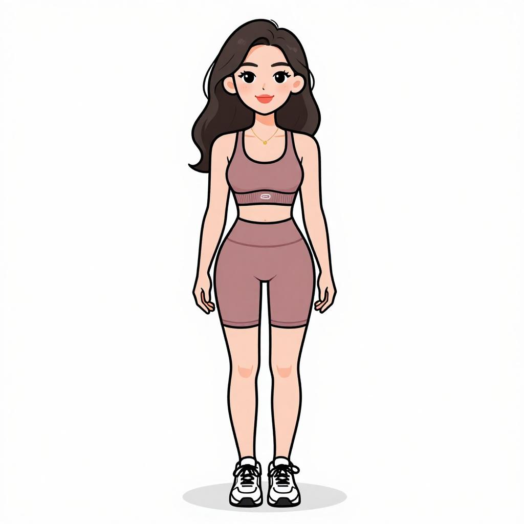 Digital illustration of a smiling young woman with light brown skin and shoulder-length dark brown hair. She has large, expressive eyes and wears a white sports bra, revealing a toned midriff, and maroon high-waisted leggings. She is also wearing white sneakers with black laces. Her stance is confident, with one hand slightly raised. The background is plain white, making her the focal point. The art style is cartoonish with bold outlines and bright colors, emphasizing her athletic and fit appearance.