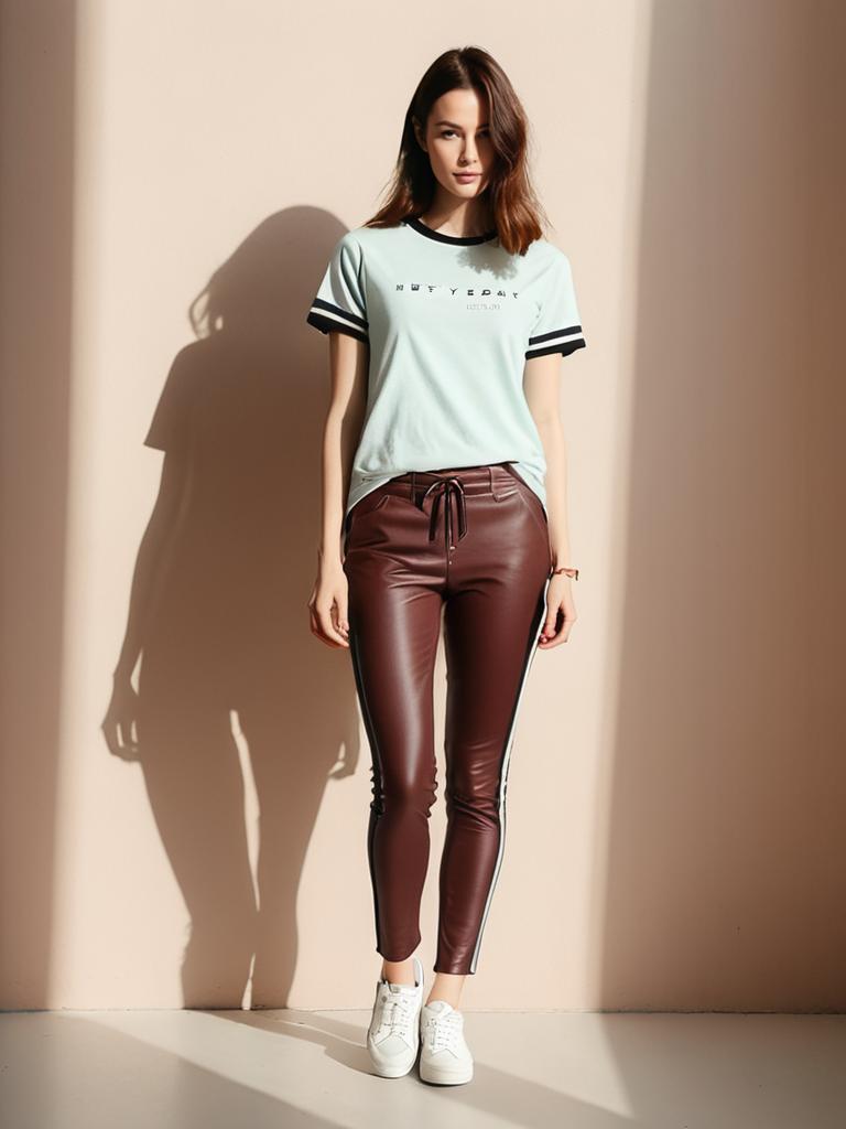 Casual Woman in White T-Shirt and Burgundy Leather Leggings