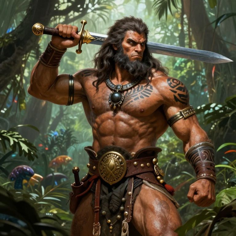 A muscular Barbarian in a jungle setting, adorned with tribal markings and jewelry, wielding a sword, reminiscent of Frank Frazetta's style.