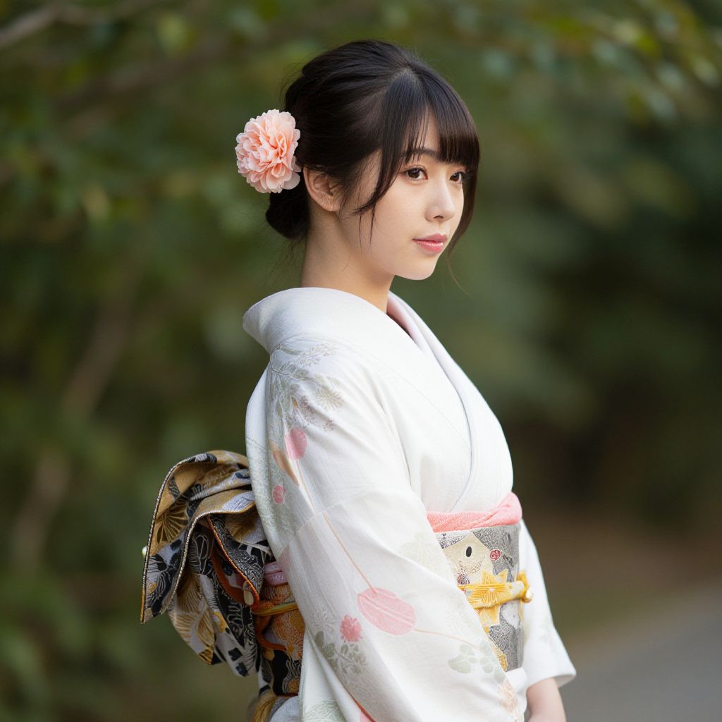"Tamayo Kimono, woman in a kimono with a flower in her hair"
