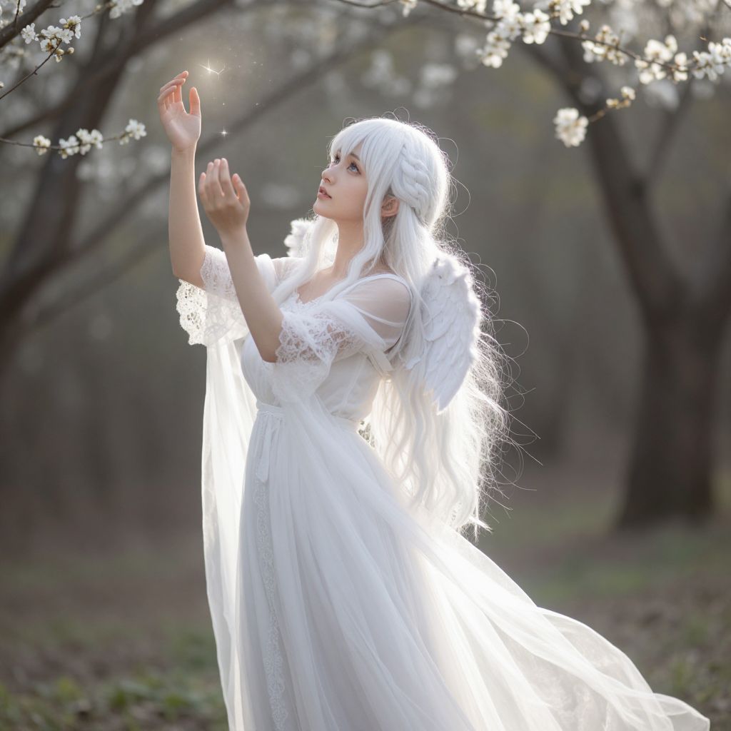 A beautiful young woman with long, flowing white hair and gentle blue eyes stands in a serene forest clearing, wearing a delicate white dress angel costume with lace sleeves and a flowing, ethereal cape. Sunlight filters through the trees, casting soft golden rays on her translucent white dress, as she gently raises her hands toward the sky, glowing faintly with a divine aura. The background features blooming white flowers and a quiet, peaceful atmosphere.. The woman has big tits and cute face