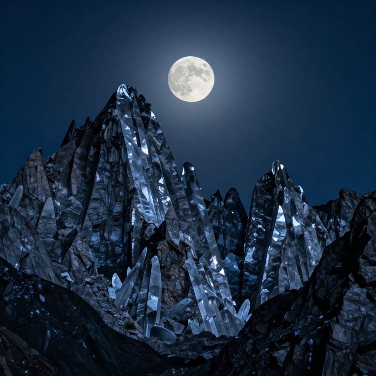 Under the watchful glow of a luminous moon, jagged mountain peaks rise like crystalline shards, their silhouettes etched against a starlit sky, as if sculpted by an unseen hand in a world where rock and light intertwine.