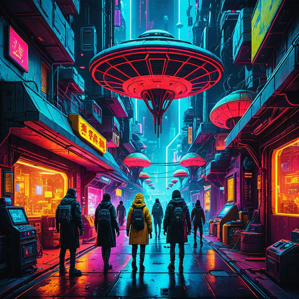 Futuristic sci-fi art depicting a neon-lit cybernetic marketplace buzzing with androids, crowded streets adorned with glowing holograms and robotic vendors, futuristic urban landscape, high-tech, renewable energy, ultra-detailed, sleek design, atmospheric lighting