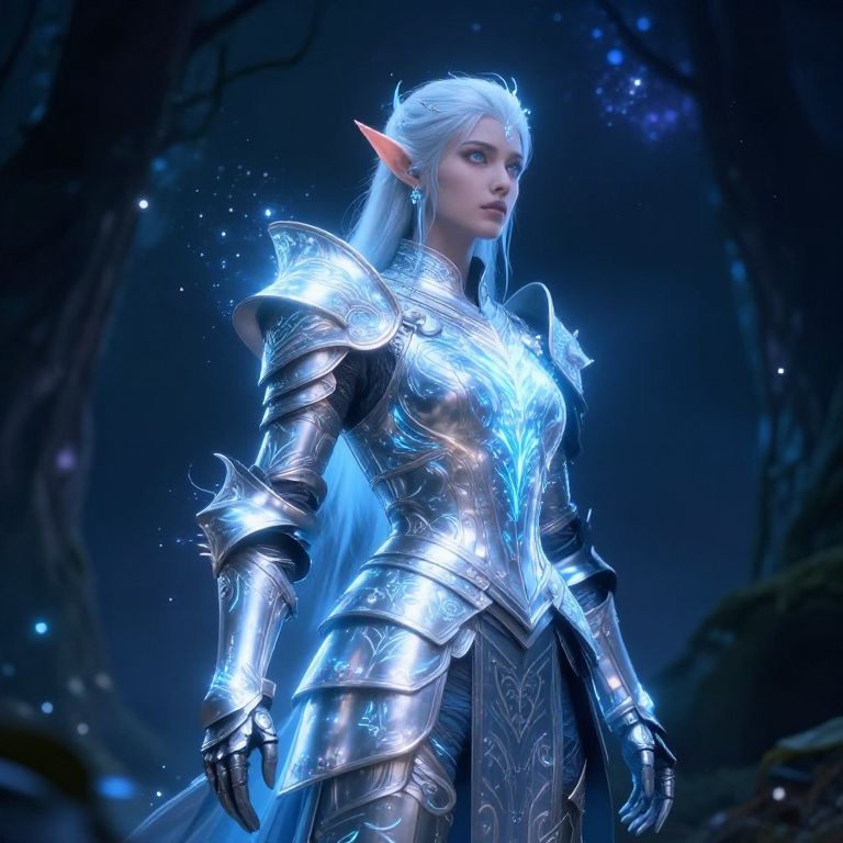 Digital artwork of a silver-haired, elf-like woman with pointed ears, wearing glowing, ornate silver armor in a dark, starlit forest.