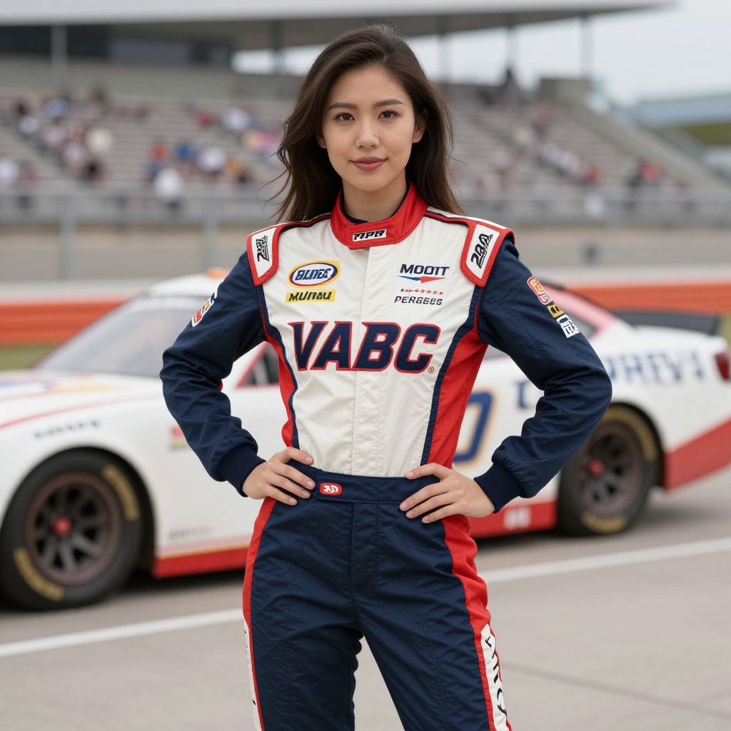 Nascar Driver Woman Costume, a woman in a racing suit posing for a picture