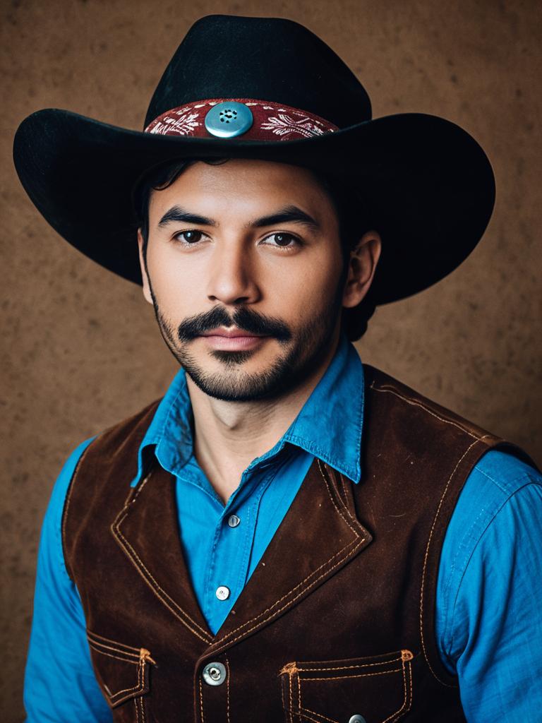 Portrait of a man dressed in a gardener costume featuring a black cowboy hat, blue and white plaid collared shirt, and dark overalls. He has a neatly trimmed beard and mustache, black hair, and is standing outdoors with a blurred natural background.