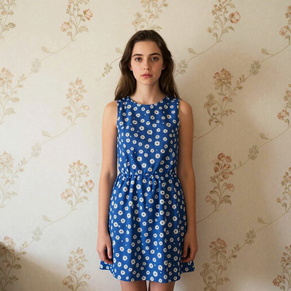 Photograph of a young woman with long brown hair, wearing a blue sleeveless dress with white daisy patterns, standing against a floral-patterned wallpaper