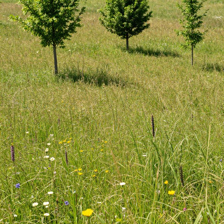 A sunny meadow with wild plants, scattered flowers, and young trees, capturing the natural beauty and tranquility of a wild landscape