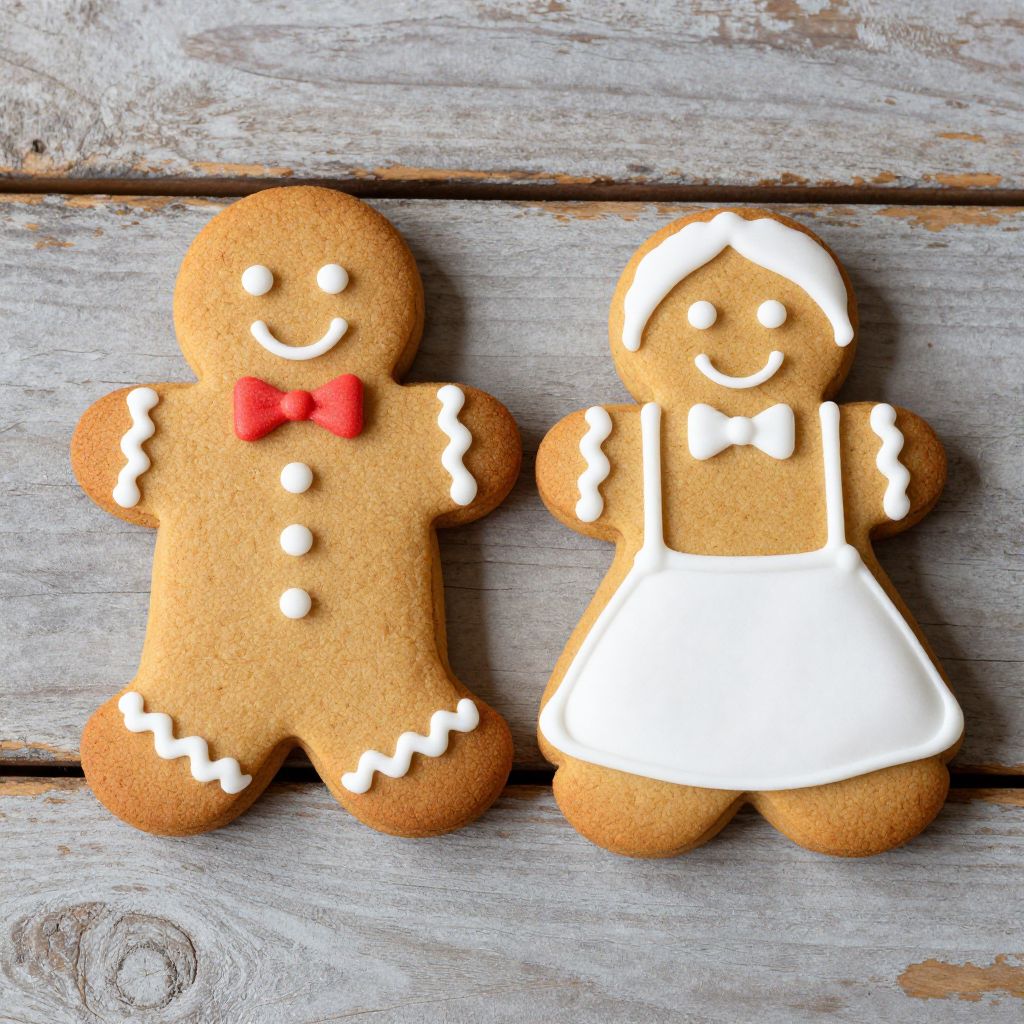 Photograph of two gingerbread cookies; one with green bow, white icing, and three buttons, the other in white dress with red bow and icing