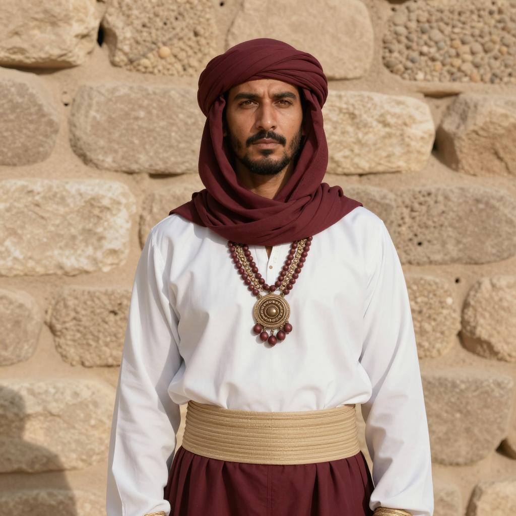 Photorealistic portrait of a Middle Eastern man wearing traditional Arabian desert clothing including a maroon headscarf, white long-sleeve shirt, maroon pants with a beige sash, and a detailed bead necklace. He stands solemnly in front of a beige stone wall under sunlight, showcasing a serious expression with a mustache and short beard. The image highlights cultural and historical attire with warm natural tones.