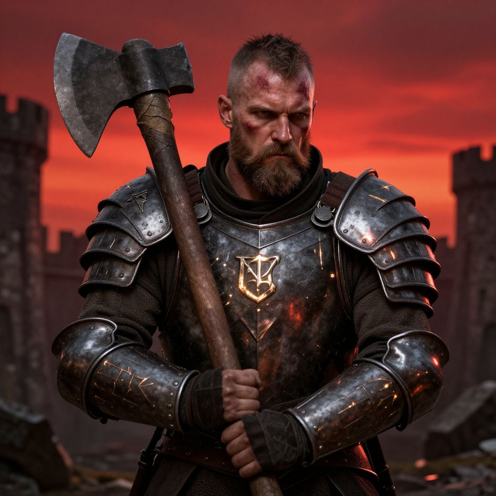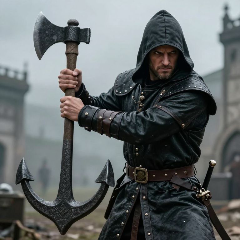 Anchor Point a medieval executioner wearing black leather and a hood, looking intimidating, about to swing his Axe, hyper-realistic, 4k,