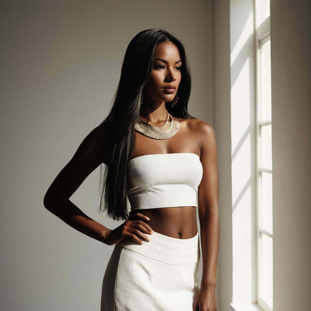Woman wearing minimalist red bandeau tube top on freckled fair-skinned woman with auburn hair posed slight three-quarter turn with one hand on waist, wearing stacked bangles and bold statement earrings, against warm beige backdrop with subtle gradient, soft even studio lighting, fashion product photography, mid-length shot, high resolution, ultra-detailed